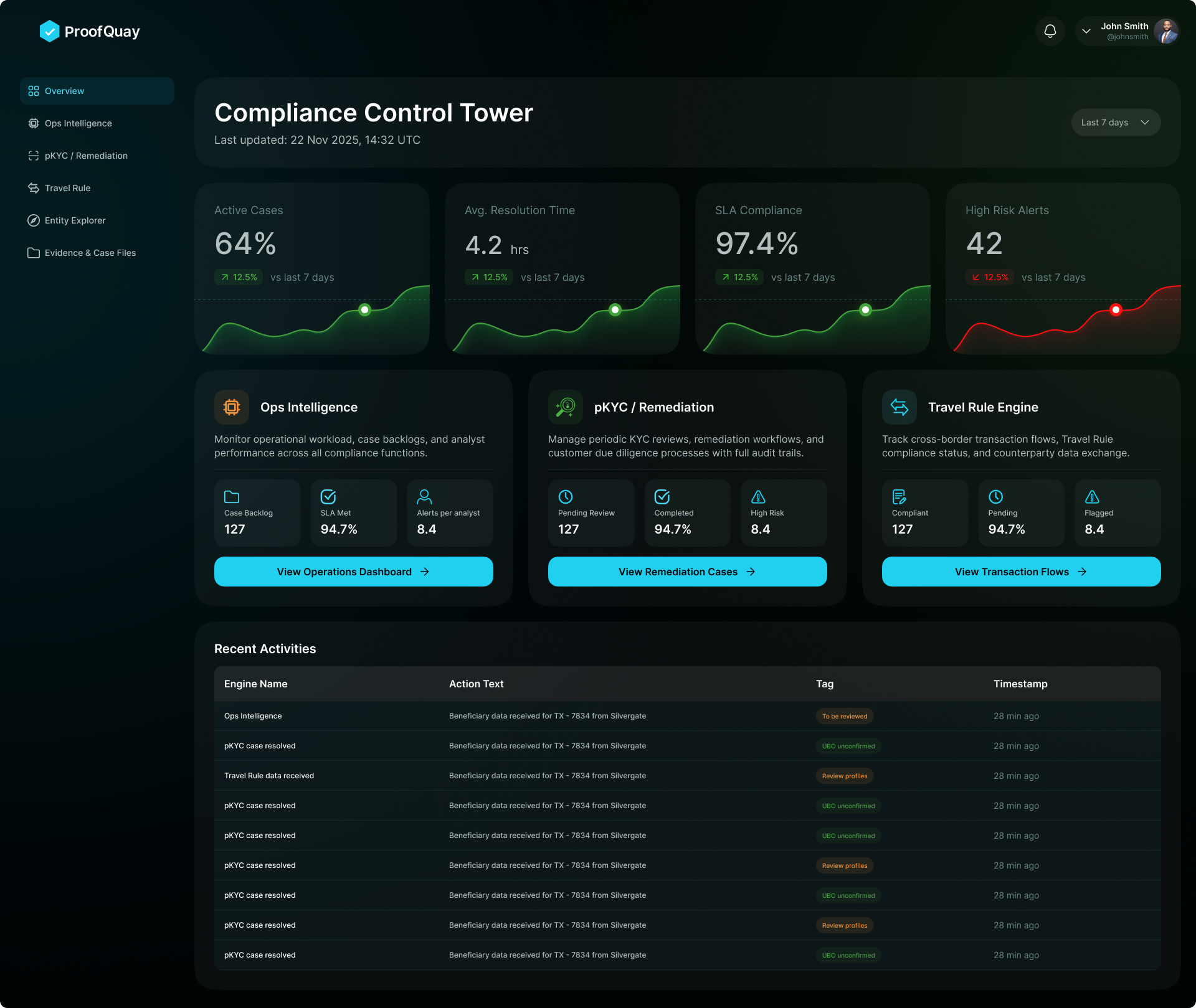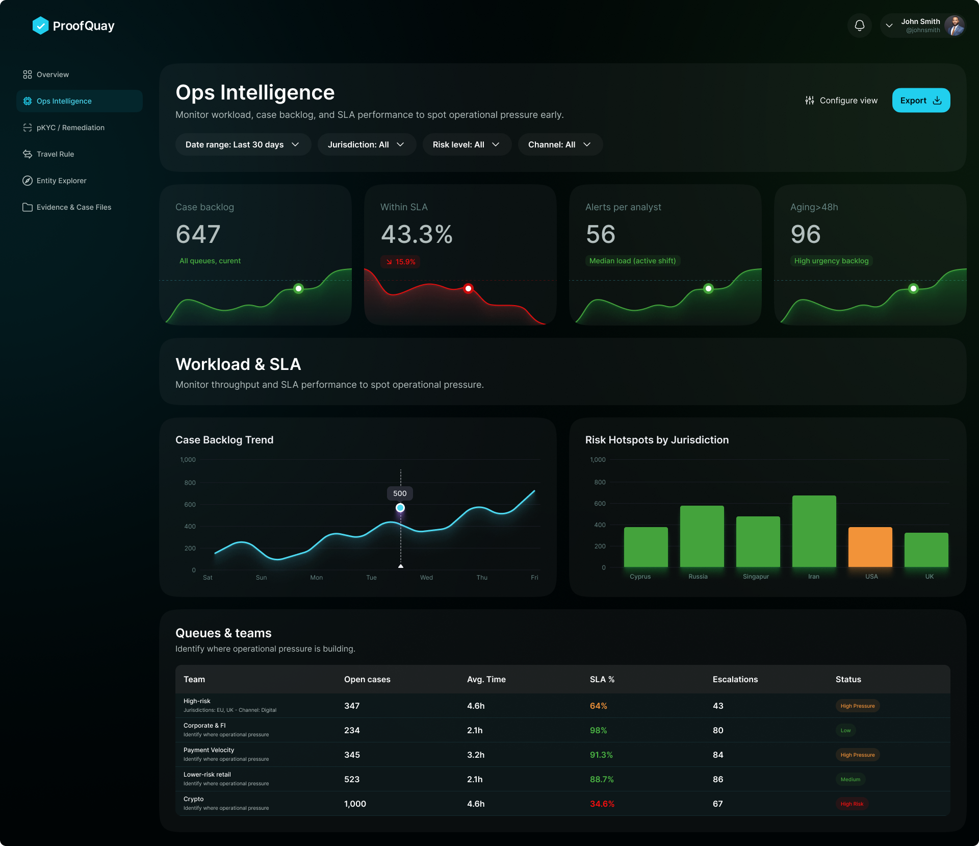 One screen for case backlog, SLA pressure, risk hotspots, and team queues. Turn compliance chaos into predictable ops.